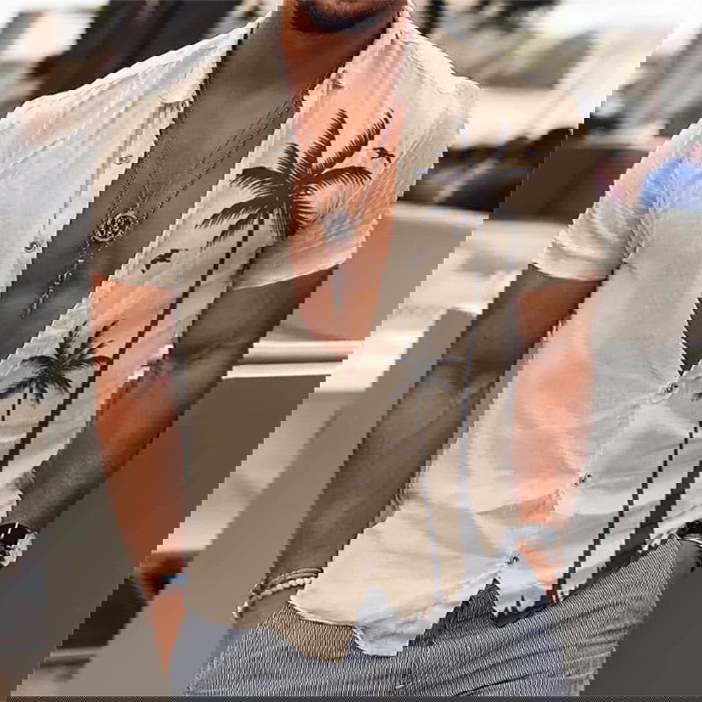 Palmier Réaliste. Conçue pour les hommes qui aiment allier style et confort, cette chemise se distingue par son impression vibrante de palmiers réalistes, évoquant l'esprit des vacances tropicales.